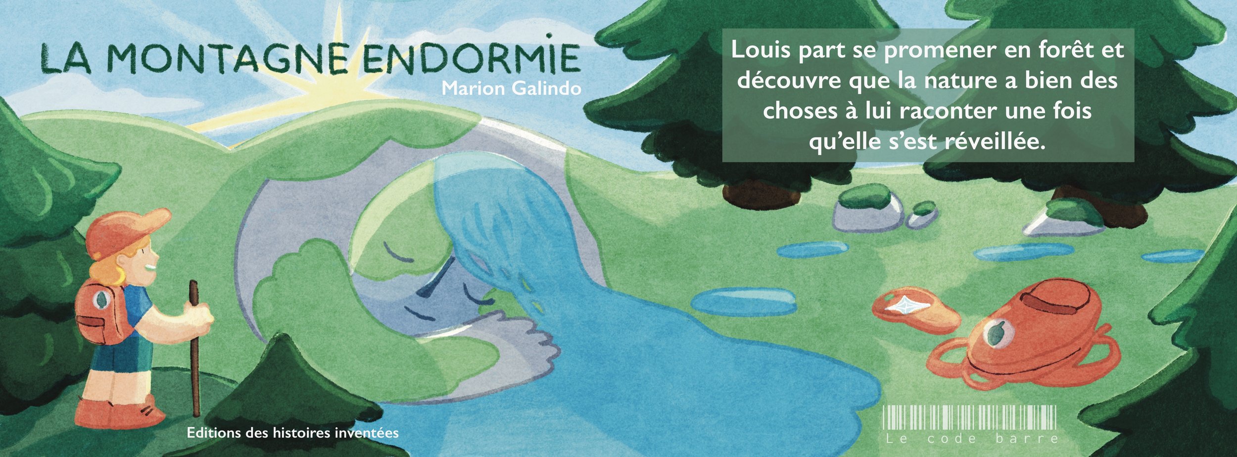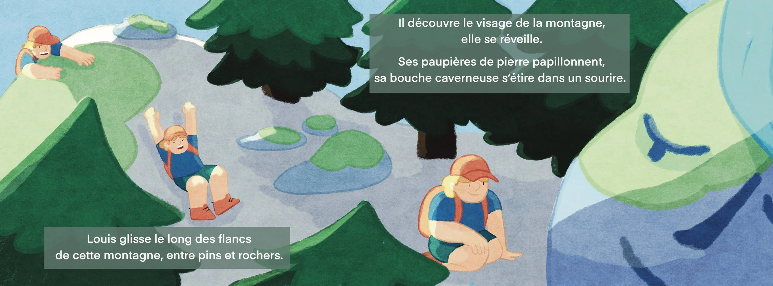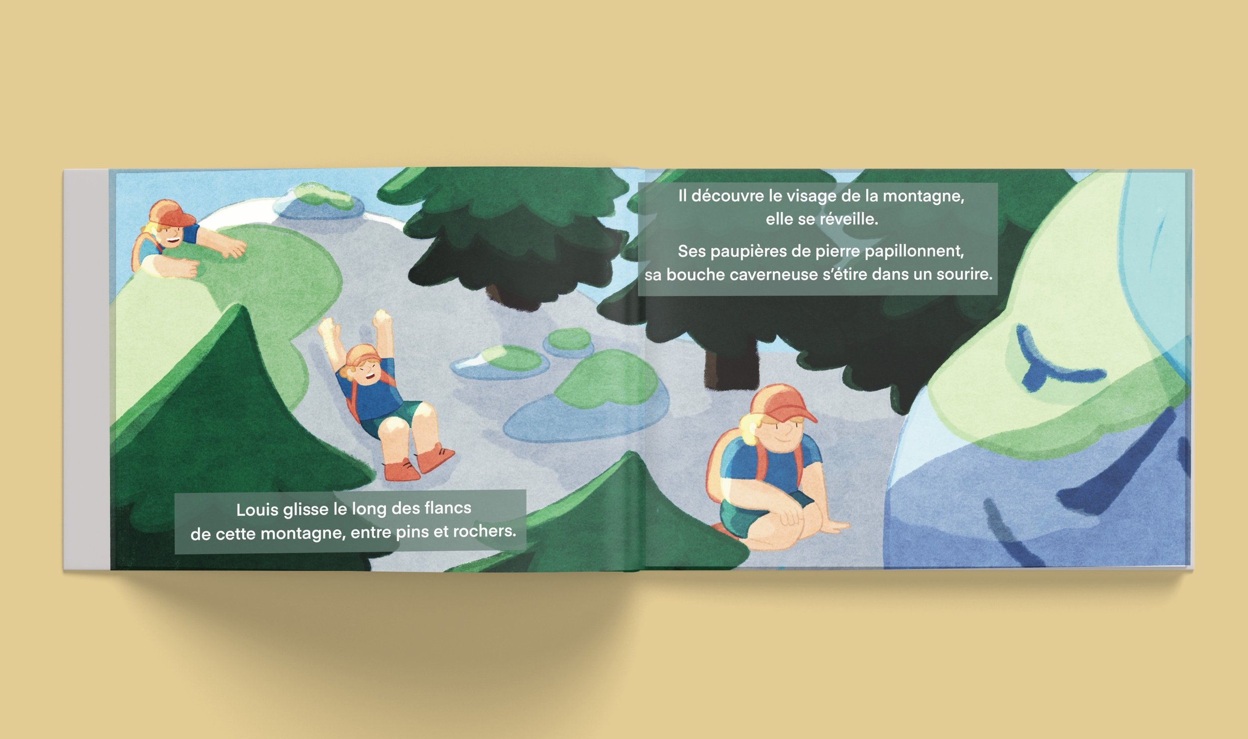 Projet fictif d’un conte illustré, un garçon réveille une montagne endormie et deviennent amis.