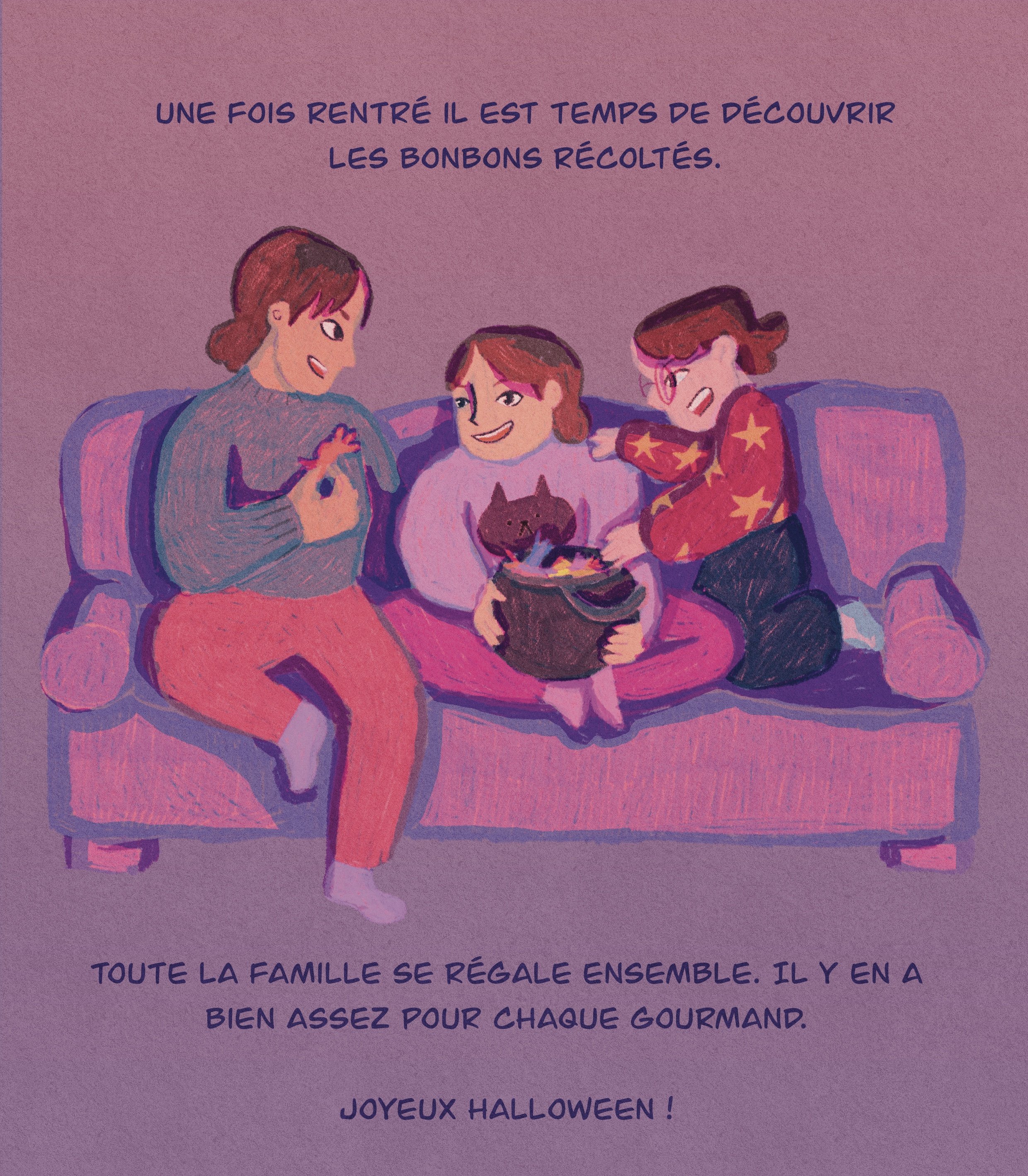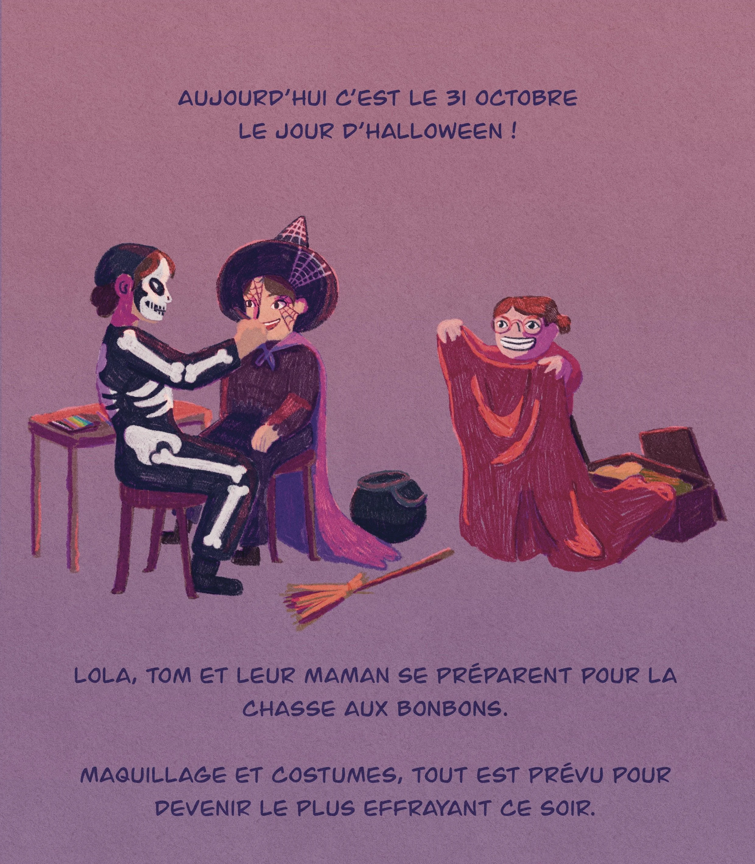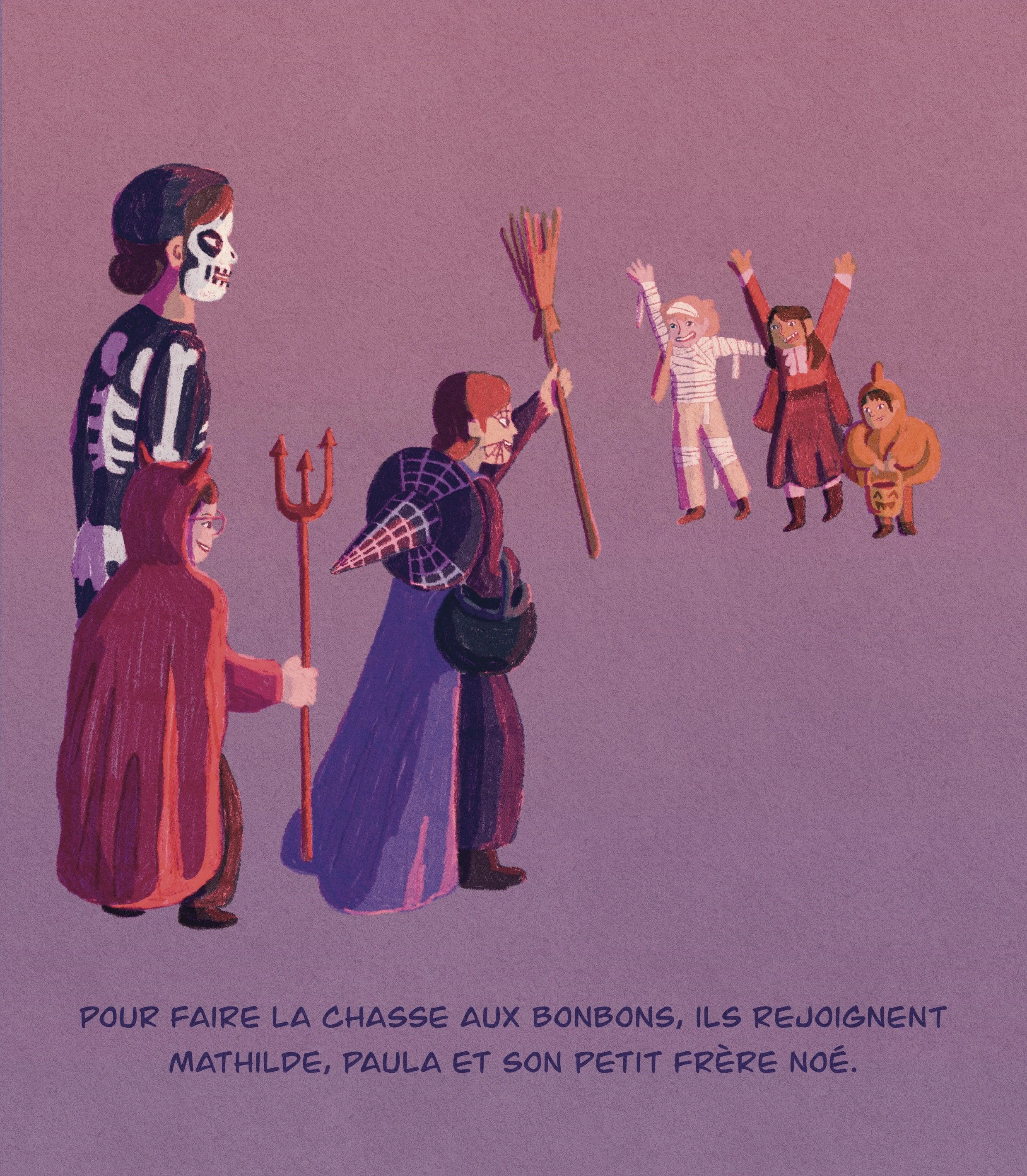Histoire courte qui suit une famille qui fête Halloween et part à la chasse aux bonbons. J’ai illustré cette histoire pour un challenge d’Halloween, voulant montrer une diversité de personnages et pouvant les relier ensemble avec une narration simple d’une aventure simple et réaliste.